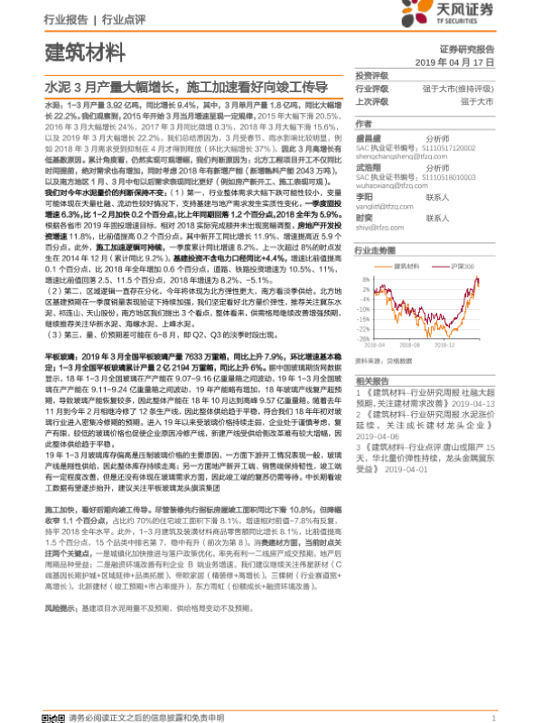 【天风证券】【20190417】建筑材料:水泥3月产量大幅增长,施工加速看好向竣工传导-5页 行业研究