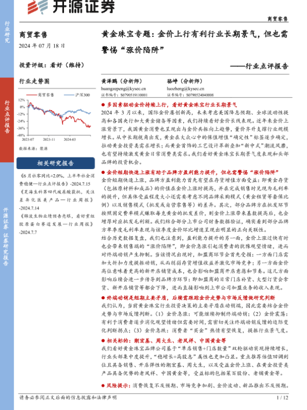 【开源证券】【20240718】商贸零售行业点评报告-黄金珠宝专题:金价上行有利行业长期景气,但也需警惕“涨价陷阱”-12页 行业研究