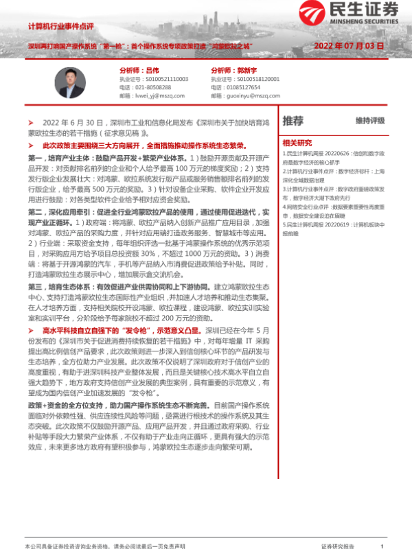 【民生证券】【20220703】计算机行业事件点评:深圳再打响国产操作系统“第一枪”:首个操作系统专项政策打造“鸿蒙欧拉之城”-3页 行业研究