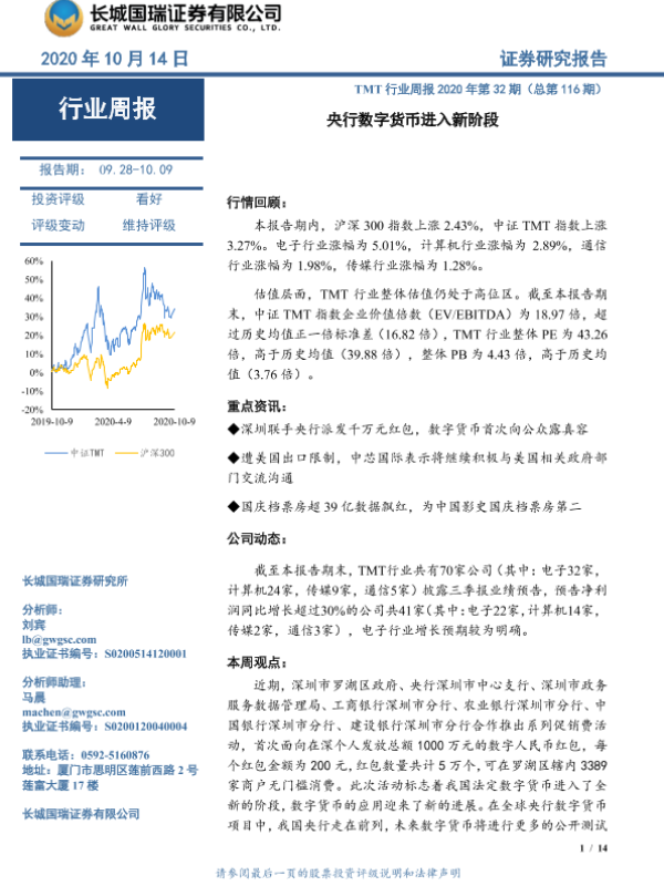 【长城国瑞证券】【20201014】TMT行业周报2020年第32期(总第116期):央行数字货币进入新阶段-14页 行业研究