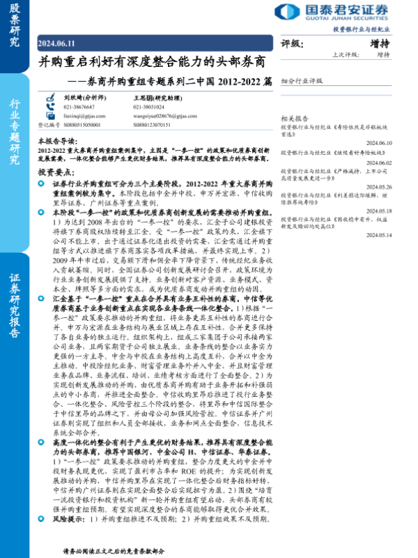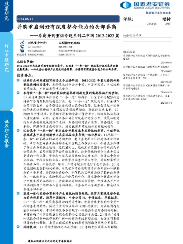 【国泰君安证券】【20240611】投资银行业与经纪业行业券商并购重组专题系列二中国2012-2022篇:并购重启利好有深度整合能力的头部券商-22页 行业研究