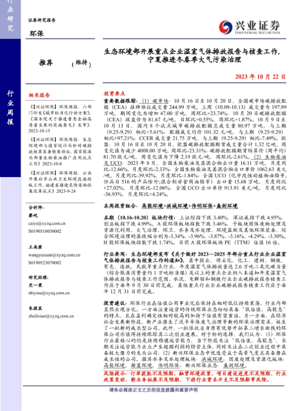 【兴业证券】【20231022】生态环境部开展重点企业温室气体排放报告与核查工作,宁夏推进冬春季大气污染治理-12页 行业研究