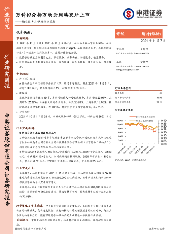 【申港证券】【20211107】物业服务及管理行业周报:万科拟分拆万物云到港交所上市-7页 行业研究