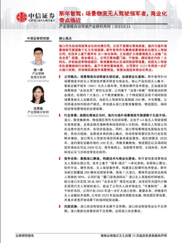 【中信证券】【20230811】产业策略自动驾驶产业研究系列:斯年智驾,场景物流无人驾驶领军者,商业化奇点临近-29页 行业研究