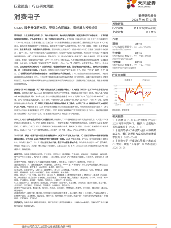 【天风证券】【20250707】消费电子行业研究周报 GB300服务器即将出货, 甲骨文合同落地, 看好算力投资机遇-17页 行业研究