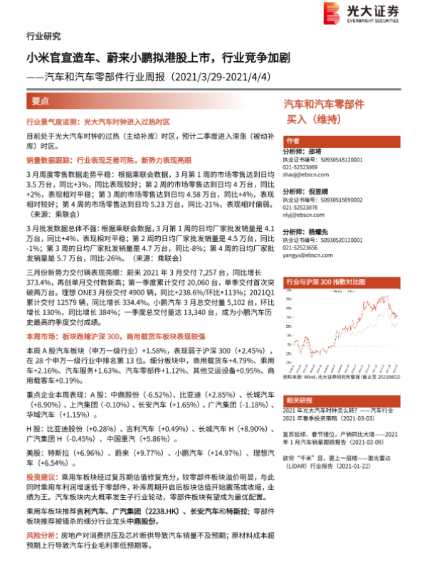 【光大证券】【20210404】汽车和汽车零部件行业周报:小米官宣造车、蔚来小鹏拟港股上市,行业竞争加剧-18页 行业研究