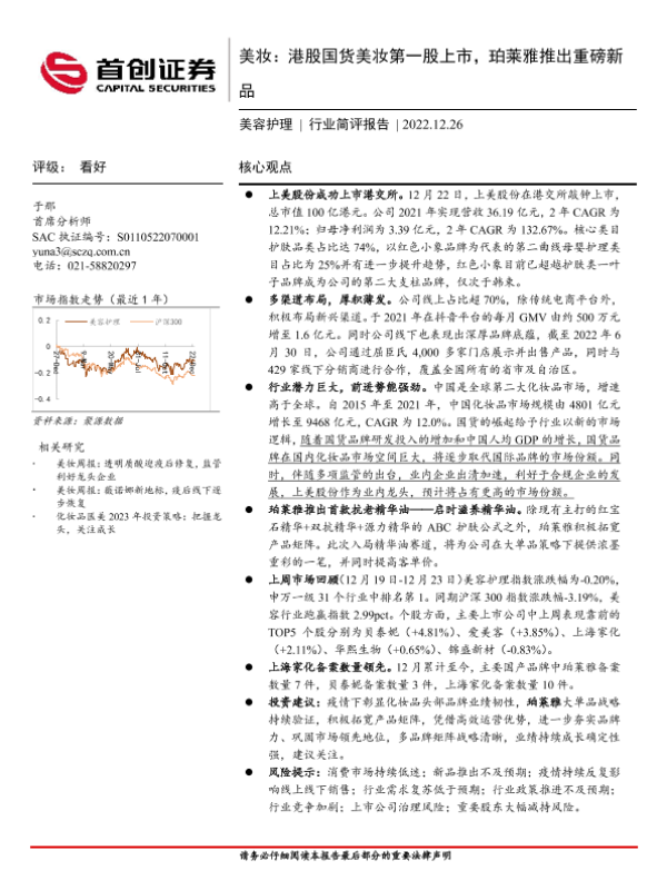【首创证券】【20221226】美容护理行业简评报告:美妆,港股国货美妆第一股上市,珀莱雅推出重磅新品-18页 行业研究