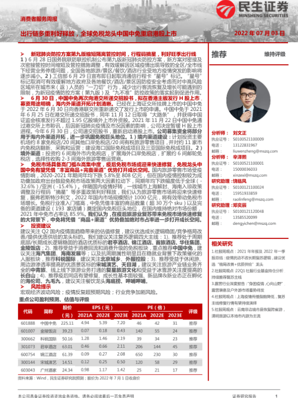 【民生证券】【20220703】消费者服务周报:出行链多重利好释放,全球免税龙头中国中免重启港股上市-27页 行业研究