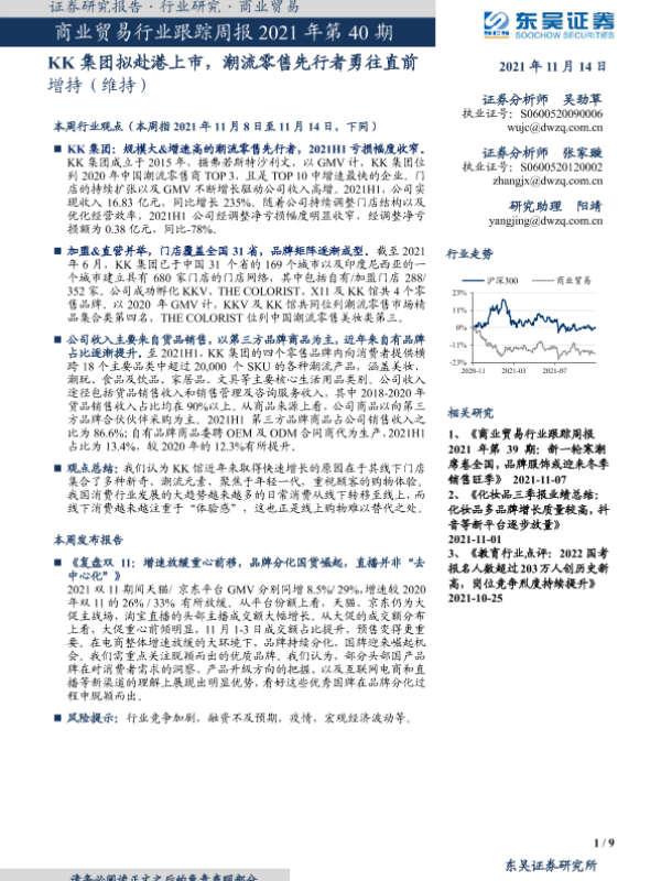 【东吴证券】【20211114】商业贸易行业跟踪周报2021年第40期:KK集团拟赴港上市,潮流零售先行者勇往直前-9页 行业研究