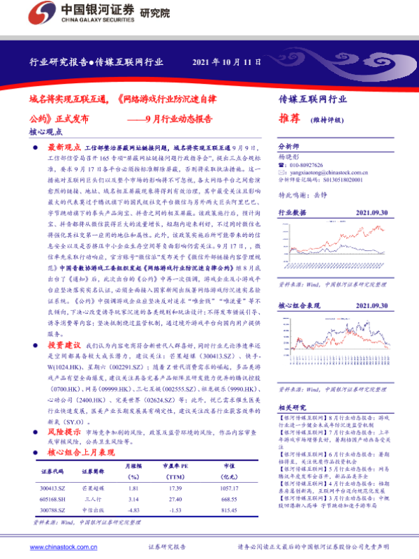 【银河证券】【20211011】传媒互联网行业9月行业动态报告:域名将实现互联互通,《网络游戏行业防沉迷自律公约》正式发布-23页 行业研究