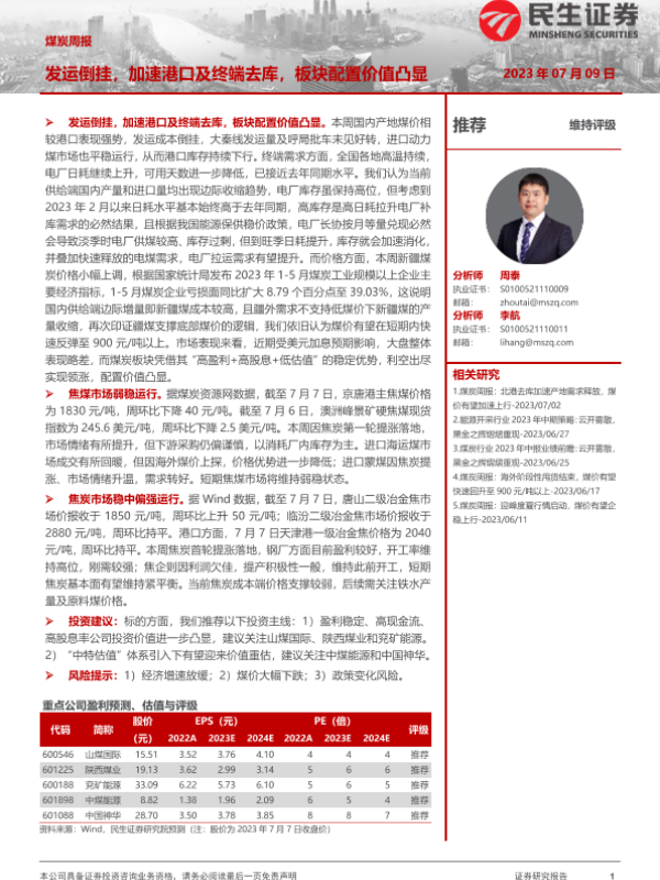 【民生证券】【20230709】20230709-民生证券-煤炭周报:发运倒挂,加速港口及终端去库,板块配置价值凸显-23页 行业研究