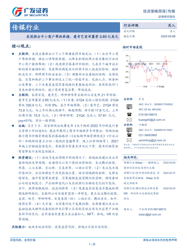 【广发证券】【20220306】传媒行业投资策略周报:美团推出中小商户帮扶举措,爱奇艺宣布募资2.85亿美元-22页 行业研究