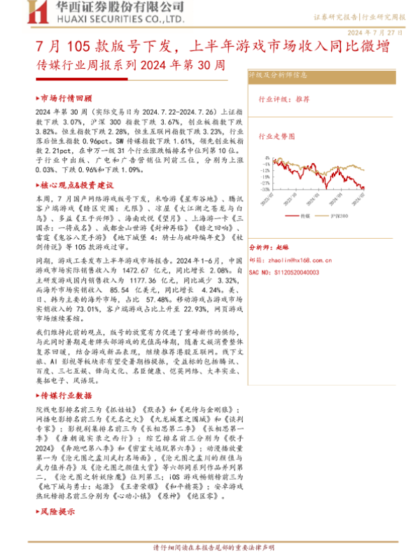 【华西证券】【20240727】2024年第30周传媒行业周报:7月105款版号下发,上半年游戏市场收入同比微增-29页 行业研究