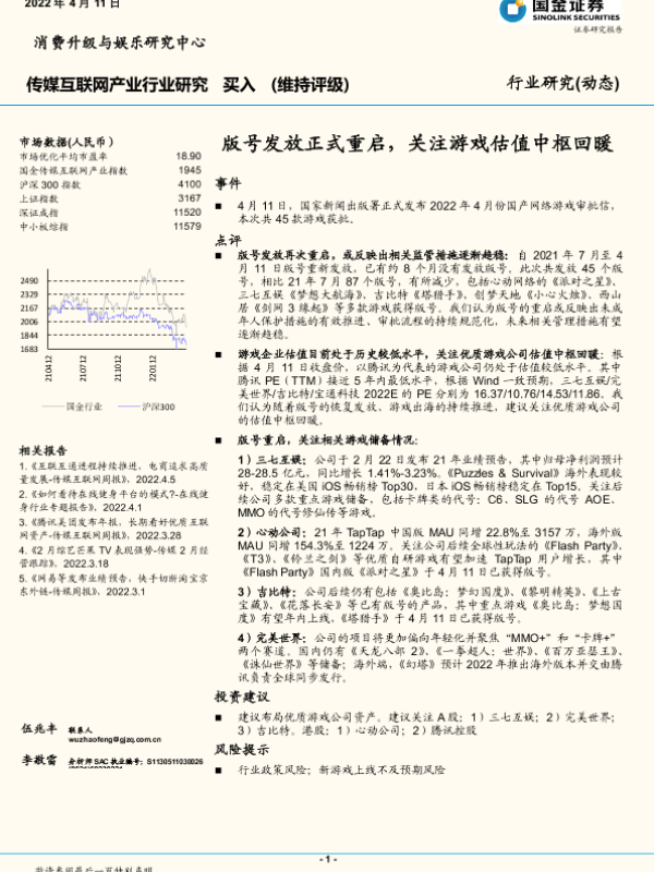【国金证券】【20220411】20220411-国金证券-传媒互联网产业行业研究:版号发放正式重启,关注游戏估值中枢回暖-5页 行业研究