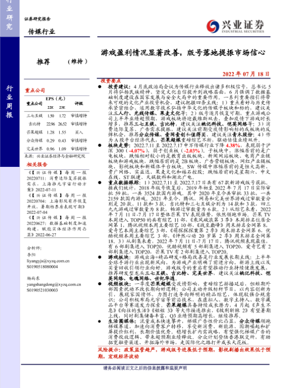 【兴业证券】【20220718】游戏盈利情况显著改善,版号落地提振市场信心-20页 行业研究