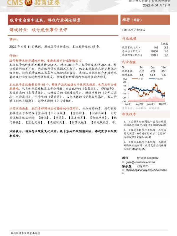 【海通证券】【20220412】游戏行业:版号发放事件点评-版号重启雪中送炭,游戏行业供给修复-2页 证券期货研究报告