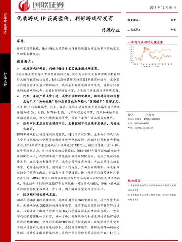 【国联证券】【20191204】传媒行业:优质游戏IP获高溢价,利好游戏研发商-4页 行业研究