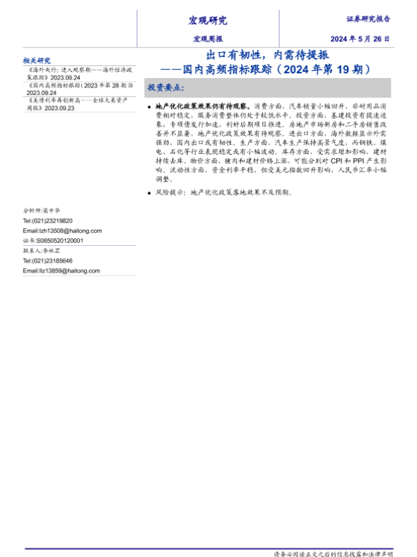 【海通证券】【20240526】国内高频指标跟踪(2024年第19期):出口有韧性,内需待提振-12页 行业研究