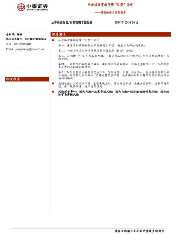 【中泰证券】【20240524】当前经济与政策思考:从价格看实物消费“K型”分化-16页 行业研究