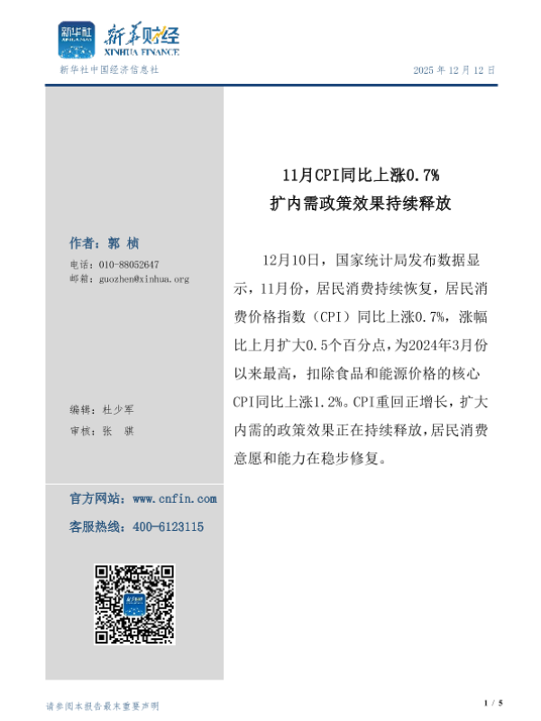 【新华社中国经济信息社】【2025】11月CPI同比上涨0.7% 扩内需政策效果持续释放-5页 宏观策略