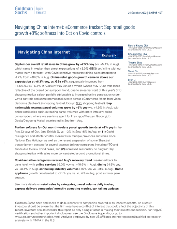 【Goldman Sachs】【20221024】tracker_ Sep retail goods growth +8%; softness into Oct on Covid controls-15页 行业研究