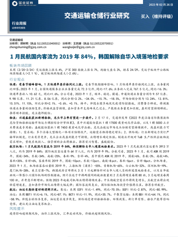 【国金证券】【20230226】交通运输仓储行业研究周报:1月民航国内客流为2019年84%,韩国解除自华入境落地检要求-14页 行业研究