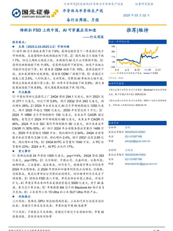 【国元证券】【20250302】半导体与半导体生产设备行业周报、月报:特斯拉FSD上线中国,AI可穿戴应用加速-11页 行业研究