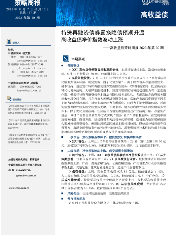 【中诚信国际】【20230813】高收益债策略周报2023年第30期:特殊再融资债券置换隐债预期升温高收益债净价指数波动上涨-15页 行业研究