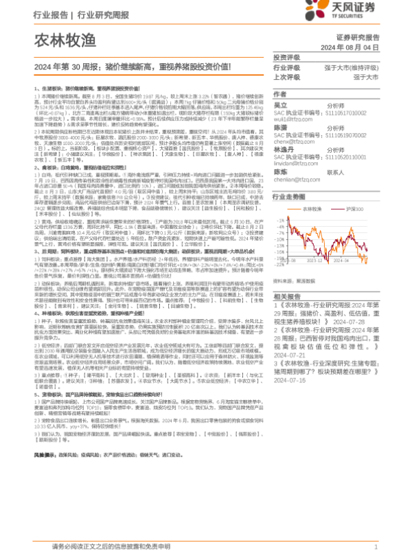 【天风证券】【20240804】2024年第30周报:猪价继续新高,重视养猪股投资价值-15页 行业研究