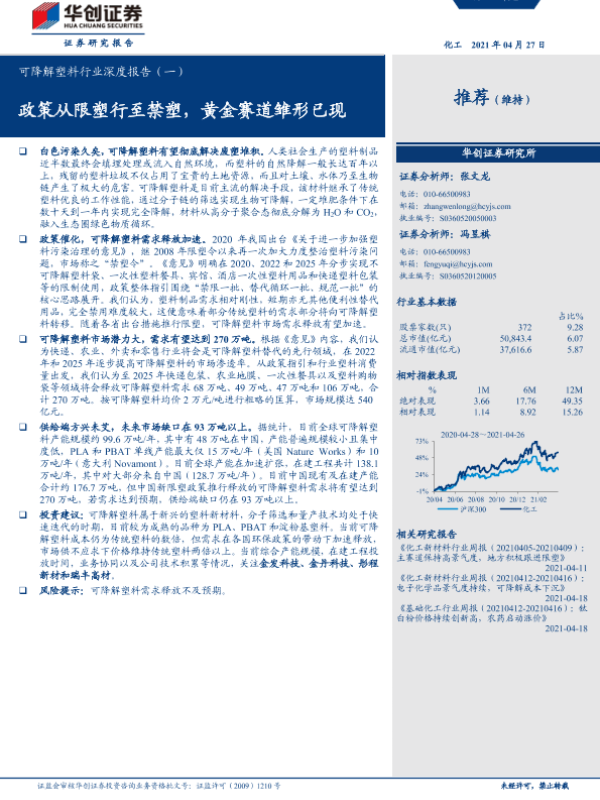 【华创证券】【20210427】可降解塑料行业深度报告(一):政策从限塑行至禁塑,黄金赛道雏形已现-27页 行业研究