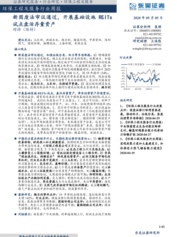 【东吴证券】【20200505】环保工程及服务行业周报:新固废法审议通过,开展基础设施REITs试点盘活存量资产-43页 行业研究
