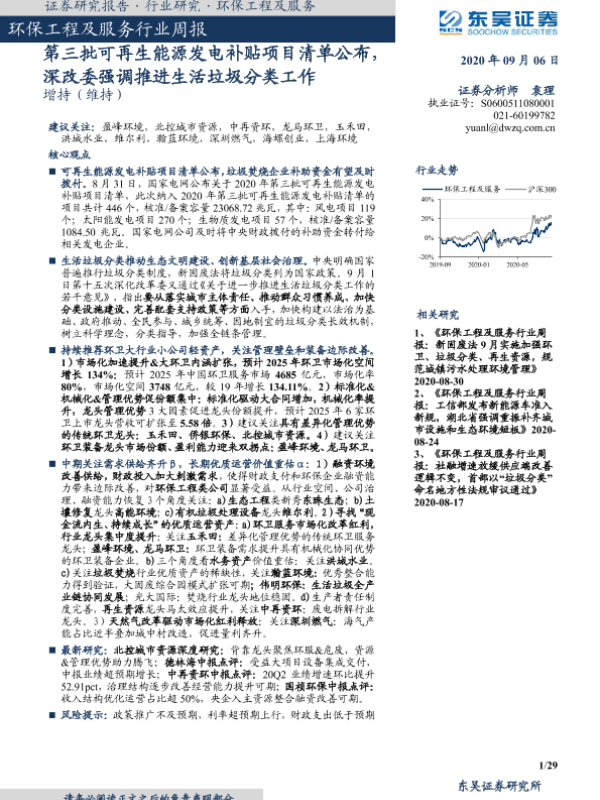 【东吴证券】【20200906】环保工程及服务行业周报:第三批可再生能源发电补贴项目清单公布,深改委强调推进生活垃圾分类工作-29页 行业研究