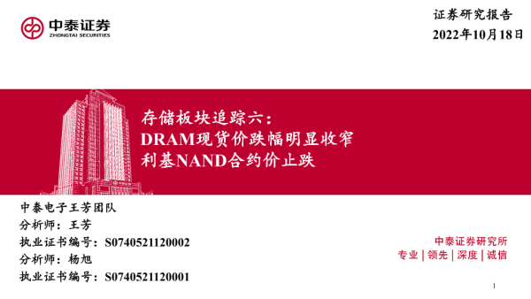 【中泰证券】【20221018】电子行业存储板块追踪六:DRAM现货价跌幅明显收窄,利基NAND合约价止跌-46页 行业研究