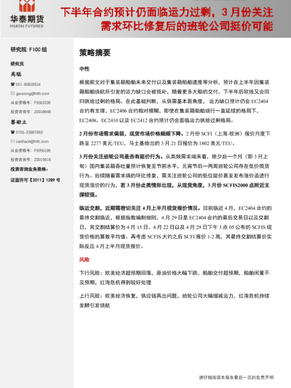 【华泰期货】【20240303】航运月报:下半年合约预计仍面临运力过剩,3月份关注需求环比修复后的班轮公司挺价可能-21页 行业研究