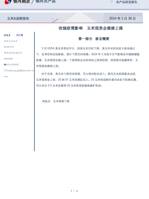 【银河期货】【20240228】玉米&淀粉报告:收储政策影响 玉米现货会继续上涨-14页 行业研究