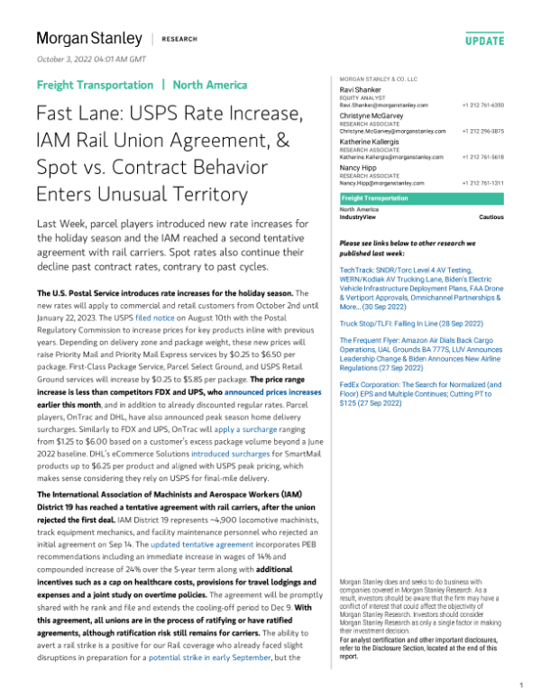 【Morgan Stanley】【20221003】Freight Transportation Fast Lane USPS Rate Increase, IAM Rail Union Agreement, & Spot vs. Contract Behavior-78页 行业研究