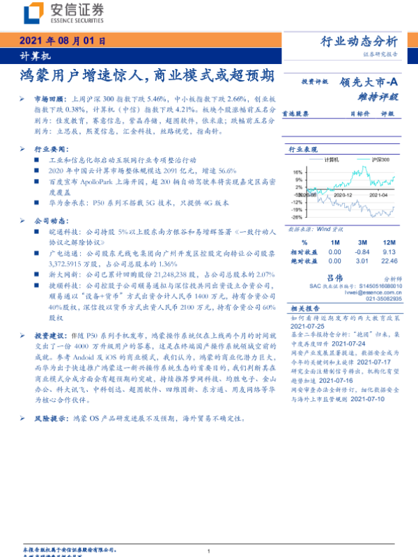 【安信证券】【20210801】计算机行业动态分析:鸿蒙用户增速惊人,商业模式或超预期-17页 行业研究