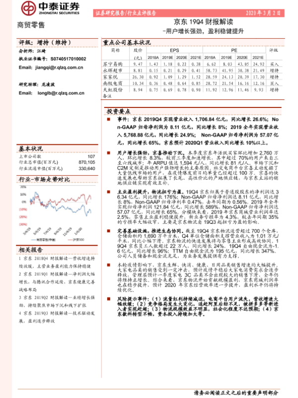【中泰证券】【20200302】京东19Q4财报解读:用户增长强劲,盈利稳健提升-8页 财报