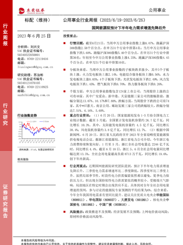 【东莞证券】【20230625】公用事业行业周报:国网能源院预计下半年电力需求增速先降后升-13页 行业研究