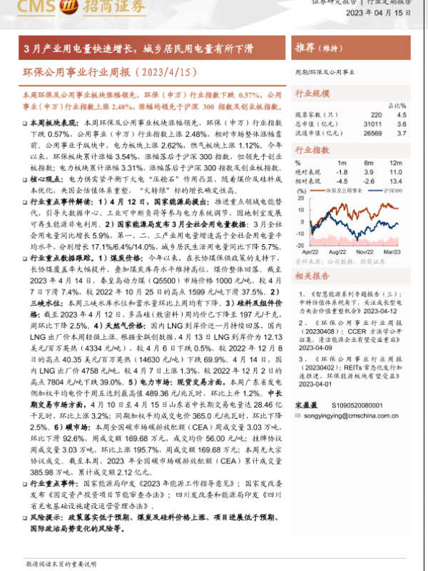 【浙商证券】【20230415】环保公用事业行业周报:3月产业用电量快速增长,城乡居民用电量有所下滑-21页 行业研究