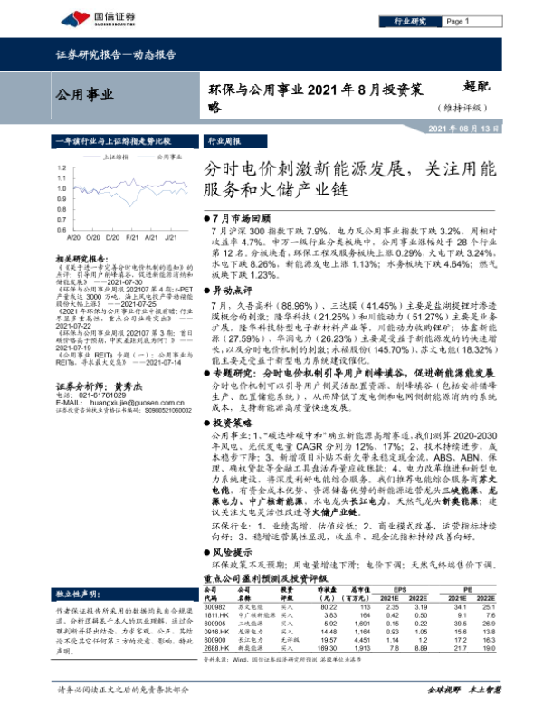【国信证券】【20210813】环保与公用事业2021年8月投资策略:分时电价刺激新能源发展,关注用能服务和火储产业链-27页 行业研究