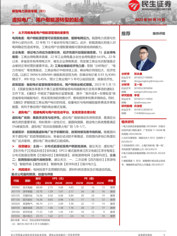 【民生证券】【20230610】电力设备及新能源行业新型电力系统专题(01):虚拟电厂,用户侧能源转型的起点-27页 行业研究