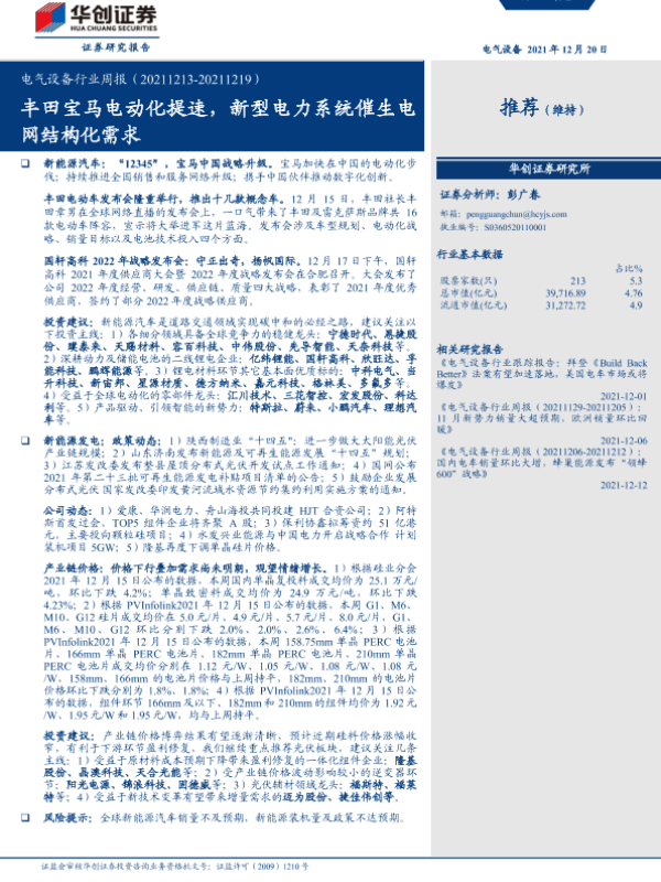 【华创证券】【20211220】电气设备行业周报:丰田宝马电动化提速,新型电力系统催生电网结构化需求-21页 行业研究