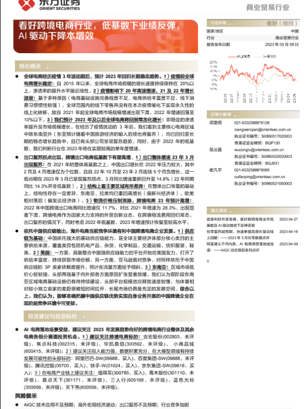【东方证券】【20230509】商业贸易行业深度报告:看好跨境电商行业,低基数下业绩反弹,AI驱动下降本增效-20页 行业研究