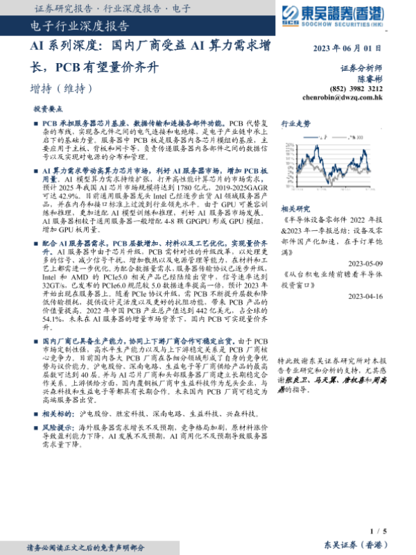 【东吴证券(香港)】【20230601】电子-AI系列深度:国内厂商受益AI算力需求增长,PCB有望量价齐升-5页 行业研究