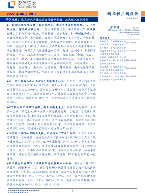 【安信证券】【20220628】IPO观察:北交所大市值公司稳步走强,正式迈入“百企”时代-22页 行业研究