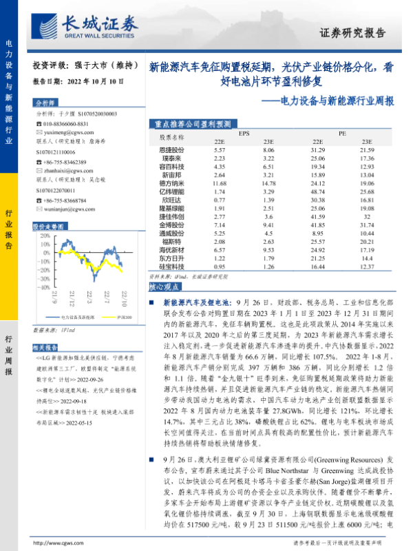 【长城证券】【20221010】电力设备与新能源行业周报:新能源汽车免征购置税延期,光伏产业链价格分化,看好电池片环节盈利修复-15页 行业研究