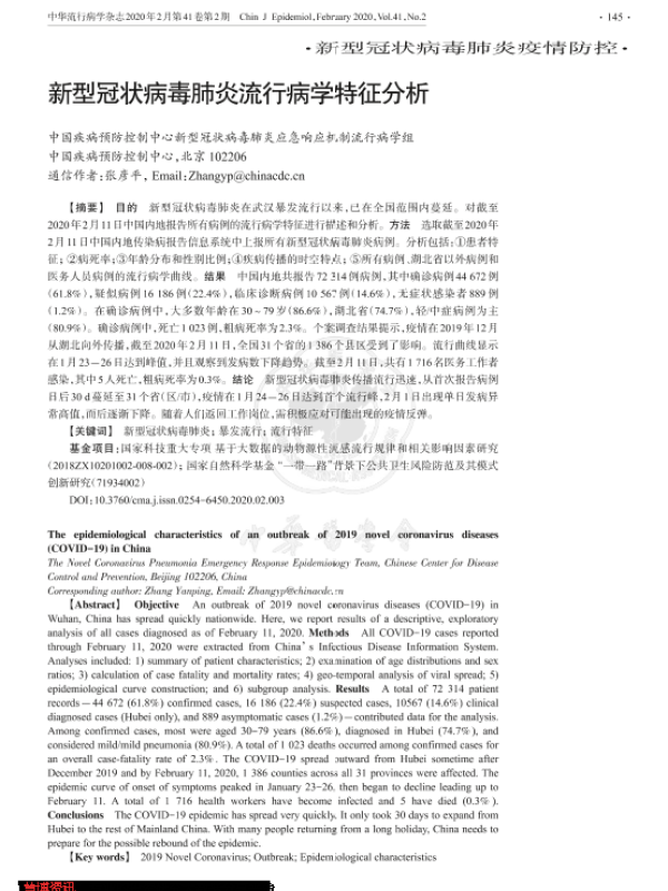 【中国流行病学杂志】【2020】新型冠状病毒肺炎流行病学特征分析-7页 学术论文