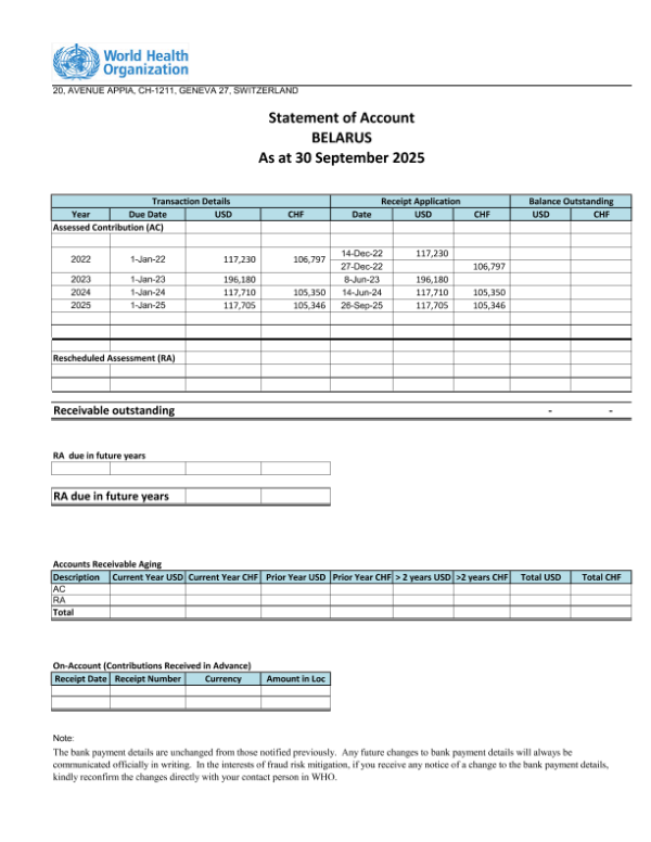 【世界卫生组织】【2025】Statement of Account BELARUS As at 30 September 2025-1页 财报