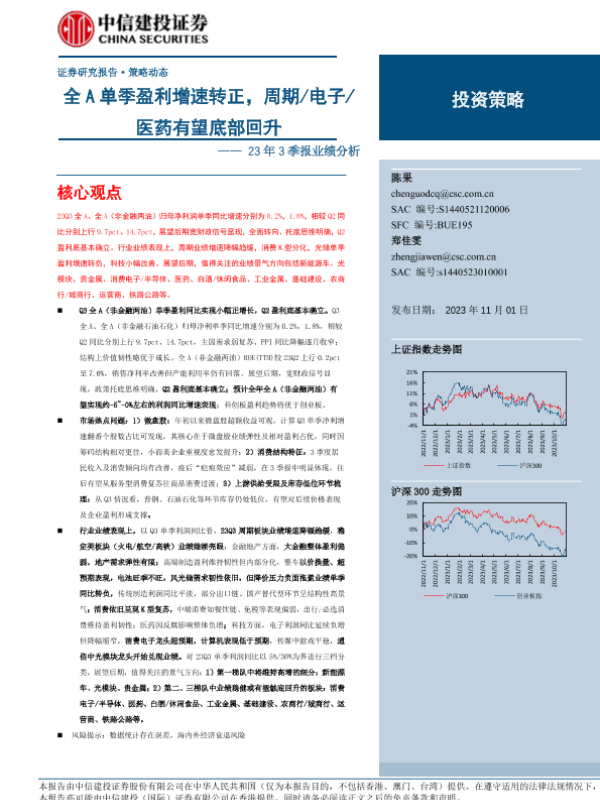 【中信建投证券】【20231101】23年3季报业绩分析:全A单季盈利增速转正,周期电子医药有望底部回升-23页 行业研究